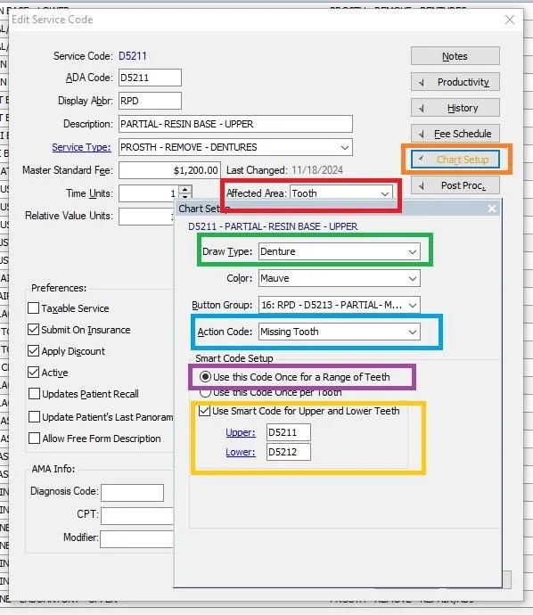 Chick the Smart Code for Upper and Lower Teeth. You may have to come back to fill in the codes for upper/lower after both codes are set up. (yellow box)