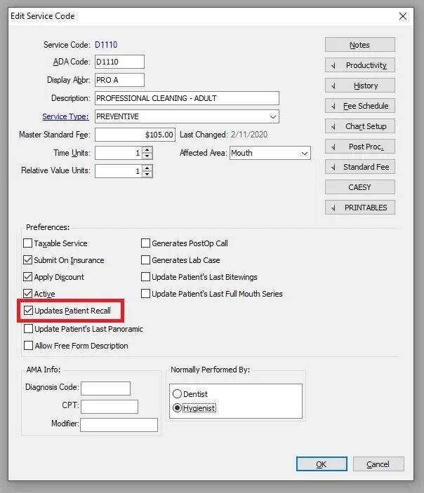 This is done by checking the Update Patient Recall within each Service Code you want to “trigger” recall (see pic)