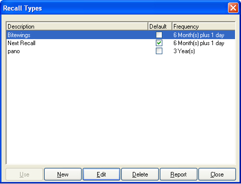 There are two ways for Eaglesoft to set a recall “cycle” (example: Every 3, 4, 6, 8 or 12 months). Depending on the Setup Preference, you can either have Multiple recalls, which allows you to create recall types like “Next Recall”, “pano”, “Bitewings”, etc. and set frequencies for those things (see picture)